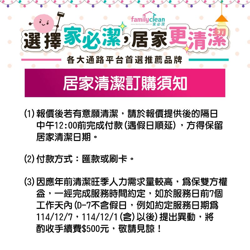 ※ 下單前請來電詢問要服務的地區是否還有人力,以免下單後排不到年前清潔時間造成您的困擾。